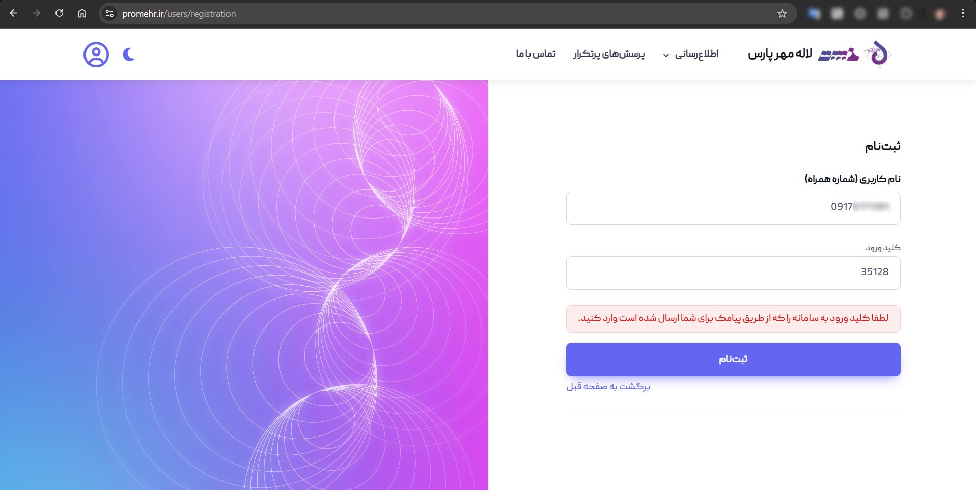یک کلید ورود برای شما پیامک می‌شود. آن را در قسمت کلید ورود وارد کرده و گزینه ثبت‌نام را انتخاب کنید.