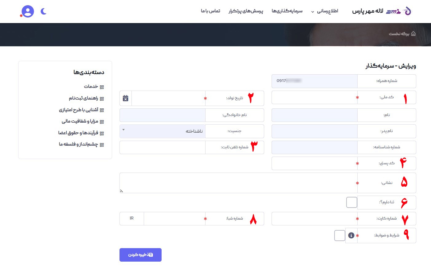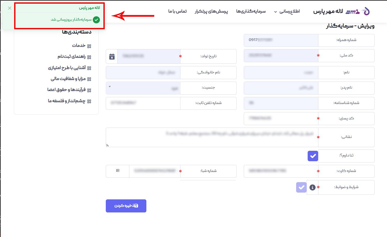 پس از وارد کردن این آیتمها دکمه ذخیره را کلیک کنید. در صورتی که پیام سبز رنگ در بخش بالا سمت چپ نمایش داده شد، اطلاعات صحیح می‌باشد. در غیر اینصور نسبت به اصلاح آن اقدام نمایید. در اینجا سامانه بصورت خودکار مشخصات فردی را از اداره ثبت استعلام کرده و پس از ذخیره، در جای خود قرار می‌دهد.